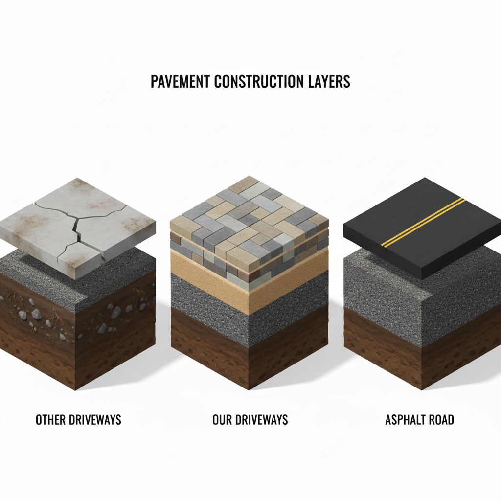 Concrete cracks. Pavers don’t. Interlocking paving stones deliver up to 8,000 PSI of strength twice as strong as concrete ensuring your driveway stays beautiful no matter what parks on it. Plus, our Permalast Layered Install System provides unmatched stability and long-term protection.